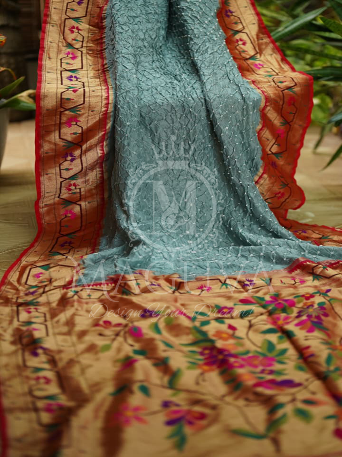 Drape yourself in timeless elegance with this sky blue crushed silk saree, beautifully complemented by a rich golden border adorned with vibrant floral embroidery. The soft silk fabric offers a graceful fall, while the intricate floral motifs in shades of pink, purple, green, and orange bring a touch of artistic charm. Perfect for weddings, festive occasions, and parties, this saree blends traditional craftsmanship with modern sophistication.